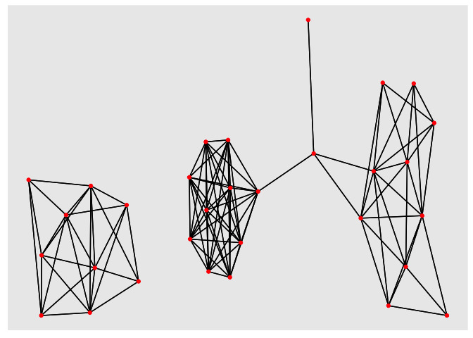 We can draw networks using the ggplot extension, ggraph. This is quite nice because it seems to show that we have three separate groups of samples. Samples within the groups are highly connected but there are few connections between the groups.