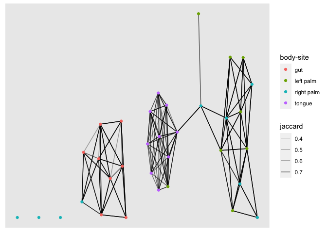 This provides us with metadata relating to the vertices in our graph. The ggraph package allows this to be added when constructing the graph. Now let’s plot the network again. This time colour the nodes according to the BodySite of sample1. We see that just using a simple jaccard distance threshold results in three (almost separate) sub-networks that separate gut, tongue and palm microbiomes.